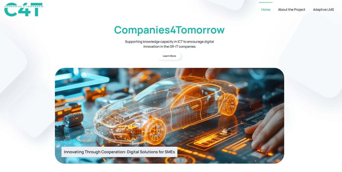 We’re excited to unveil Companies4Tomorrow (C4T) — a forward-looking digital platform designed to boost knowledge, skills and innovation capacity in ICT for businesses across Greece and Italy. Powered by tailored capacity-building tools, cutting-edge training, and industry-relevant resources, the C4T platform supports the digital transformation of SMEs and business support organisations. It offers: A comprehensive capacity building programme including a Competence Pack, Practical Toolbox and supportive actions for advancing Industry 4.0 readiness An Adaptive LMS with open online courses on topics such as: Internet of Things Cybersecurity Cloud Computing Data Analytics & Visualisation Machine Learning & Big Data 3D Printing Blockchain Generative AI And more — all co-designed to help organisations innovate and be competitive in the global digital era. Explore the platform and begin your digital transformation journey here: demo.living-lab.gr/c4t