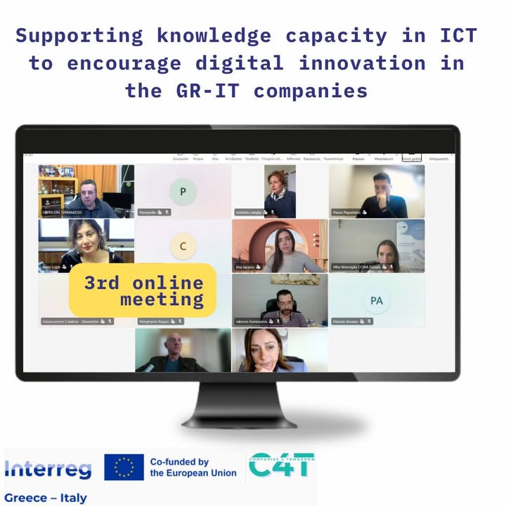 3rd Online Project Meeting Partners of the Companies for Tomorrow (C4T) Interreg Greece–Italy project successfully held their 3rd Online Meeting, discussing project progress and the next steps towards supporting digital innovation and skills development for SMEs in the Greece–Italy area. During the meeting, partners reviewed the progress of the project and focused on key activities including: -Communication & dissemination activities – including the project website, promotional materials, and social media engagement -Policy mapping and data collection on sustainable and smart digital transformation of SMEs -Benchmarking of international best practices and innovative technological solutions -Development of digital platforms, including the Adaptive LMS Platform, the SMEs Skills Taxonomy Platform, and the Skills Passport and Skills Gap tools -Preparation of Living Labs and the C4T Cross-Border Hub, supporting cooperation between Greek and Italian stakeholders Partners also discussed upcoming activities, including exchange visits, cross-border collaboration actions, and the next project meeting in Calabria in May 2026. The Companies for Tomorrow project continues to strengthen knowledge capacity in ICT and digital innovation, helping SMEs adapt to the challenges of the digital transition. #Interreg #CompaniesForTomorrow #C4T #DigitalInnovation #SMEs #GreeceItaly